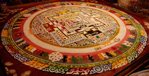 Abb. 9: Kalachakra MandalaDie Personifizierung eines Tantras, der sog. Yidam, gilt gleichzeitig als Schutzgottheit der dieses Tantra besonders betonenden Schulrichtung. Weniger für die meditative Praxis als vielmehr für die magisch-religiösen Aspekte des Lamaismus dürfte dies von Bedeutung sein, denn damit riefen die beiden einander verfeindeten Sekten die gleiche Schutzgottheit an, die zudem eine mit universellem Herrschaftsanspruch ist. Das Kalacakra wird verbunden mit auf ein tausendjähriges Reich weisenden Prophezeiungen, die ihr Augenmerk auf Rigden richten, einen großen Kriegerkönig, der die „roten“ Armeen vernichten und den Buddhismus am Ende des Zeitalters des Niedergangs wieder einsetzen würde.³⁰ Das hierin liegende Spannungsfeld ist m. E. groß genug, dass beide Orden nicht nebeneinander bestehen konnten, solange sie die Errichtung eines universalen buddhistischen Reiches anstrebten, wie es die im Kalacakra niedergelegte Vision von Shambhala widerspiegelt.